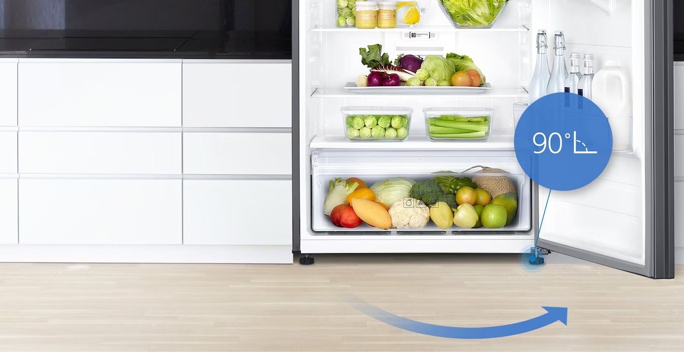 공간활용에 최적화된 피트인 냉장고 90도 도어 오픈시 좁은 공간에서도 쉽게 사용할 수 있는 구조