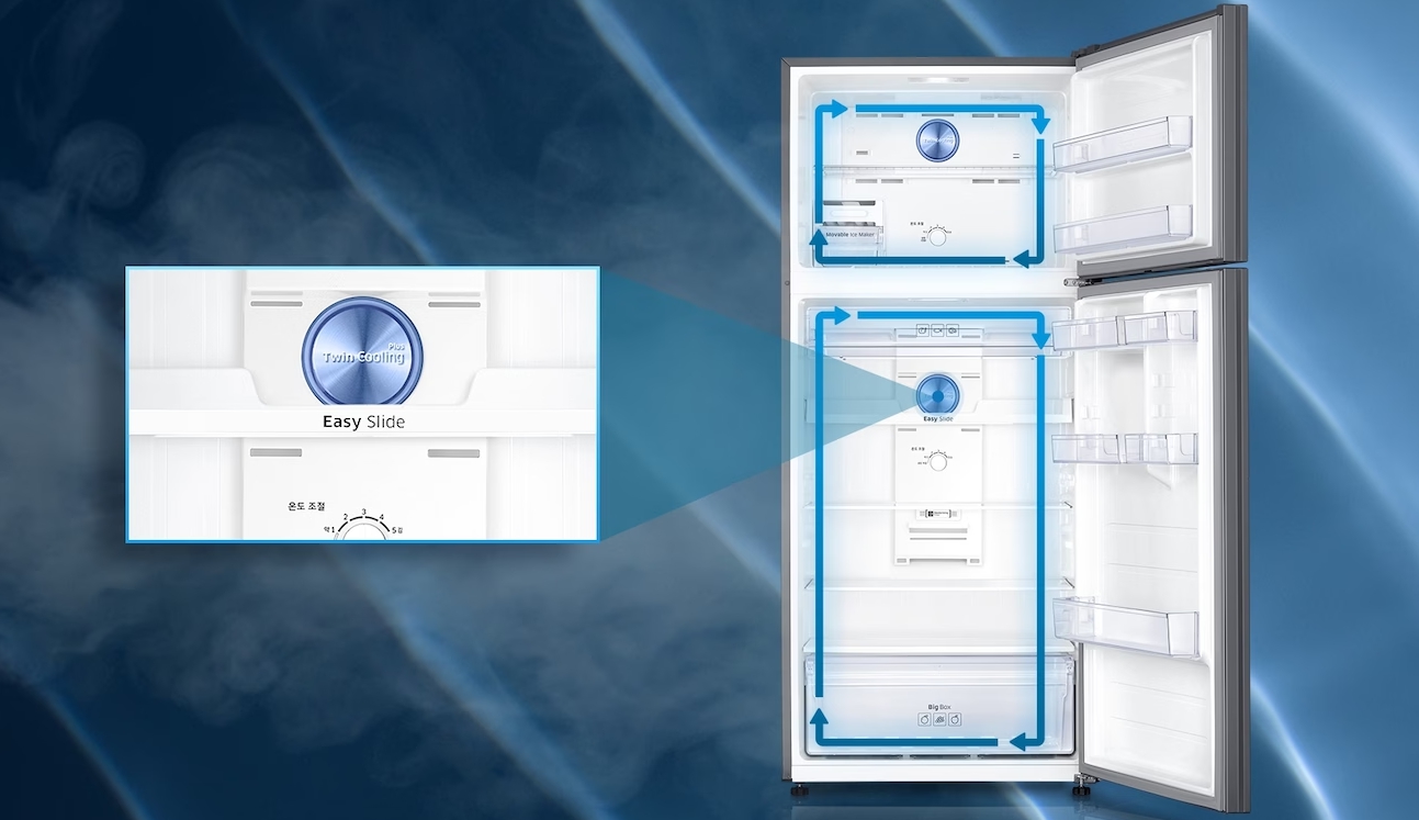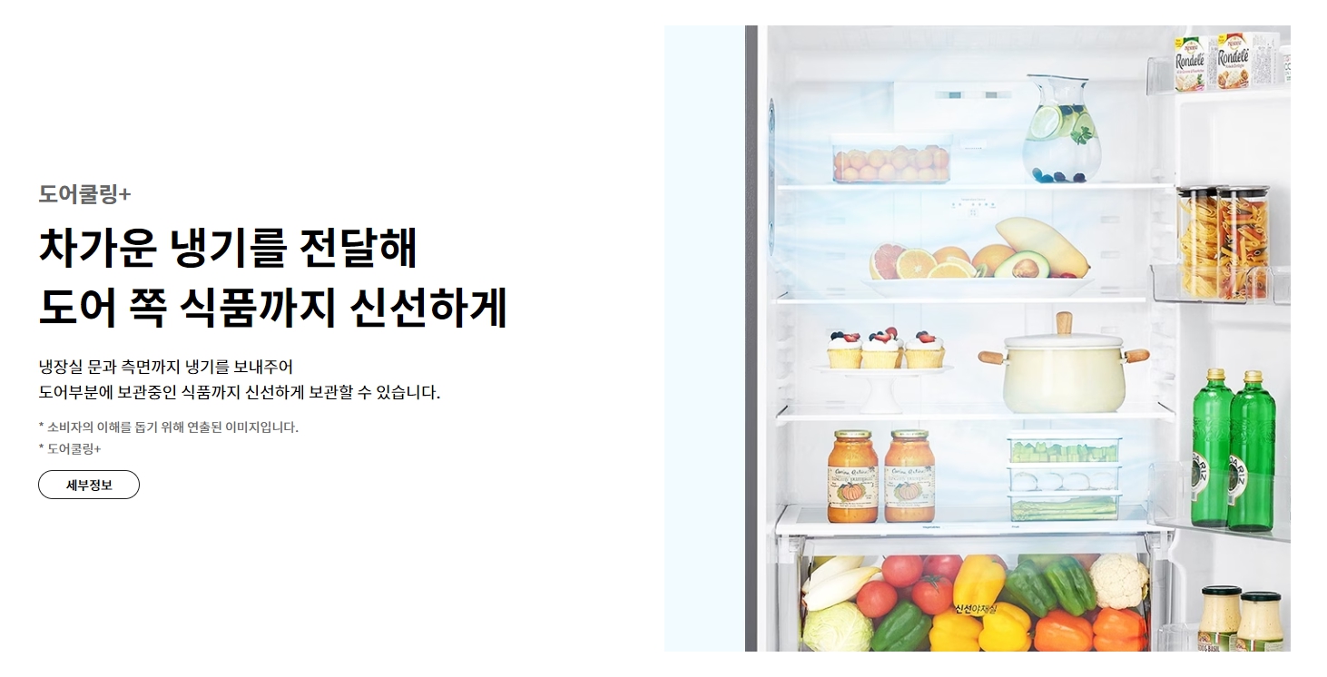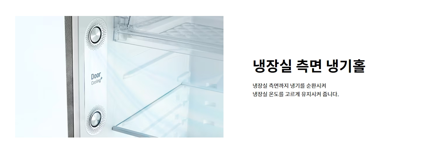 도어쿨링 + : 차가운 냉기를 전달해 도어 쪽 식품까지 신선하게 냉장실 문과 측명까지 냉기를 보내주어 도어부분에 보관중인 식품까지 신선하게 보관할 수 있습니다.