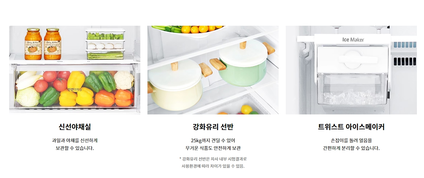 실제로 보면 내부가 넓어서 4~5인 가족이 쓰기에도 적당한 용량의 냉장고 입니다.