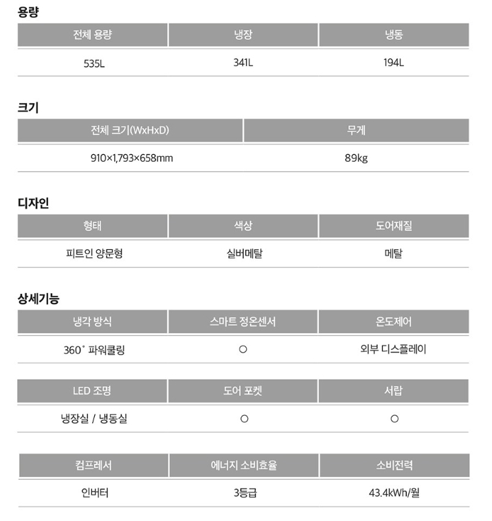 전체 용량(L) : 507 냉장 용량 : 376 냉동 용량 : 131