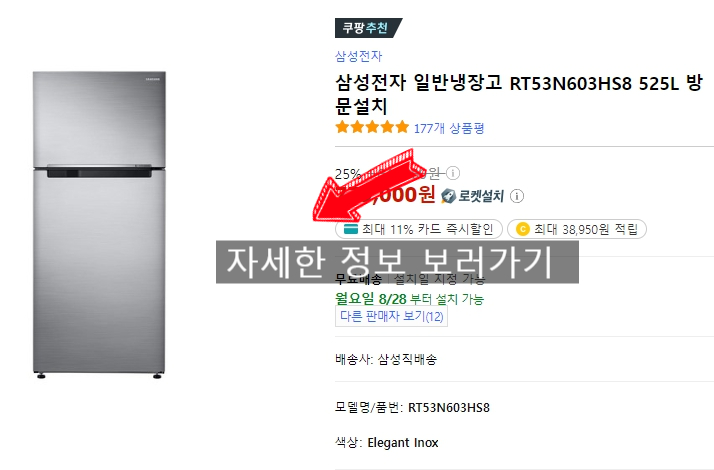 가정용 일반냉장고 500리터 중에서 삼성전자 RT53N603HS8 525L 제품이 쿠팡이나 네이버 쇼핑에서