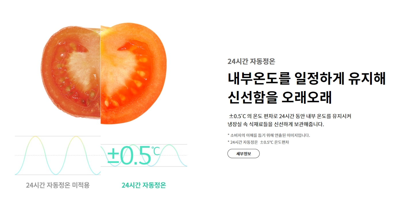 24시간 자동정온: 내부온도를 일정하게 유지해 신선함을 오래오래 ±0.5˚C의 온도 편차로 24시간 동안 내부 온도를 유지시켜 냉장실 속 식재료들을 신선하게 보관해 줍니다.
