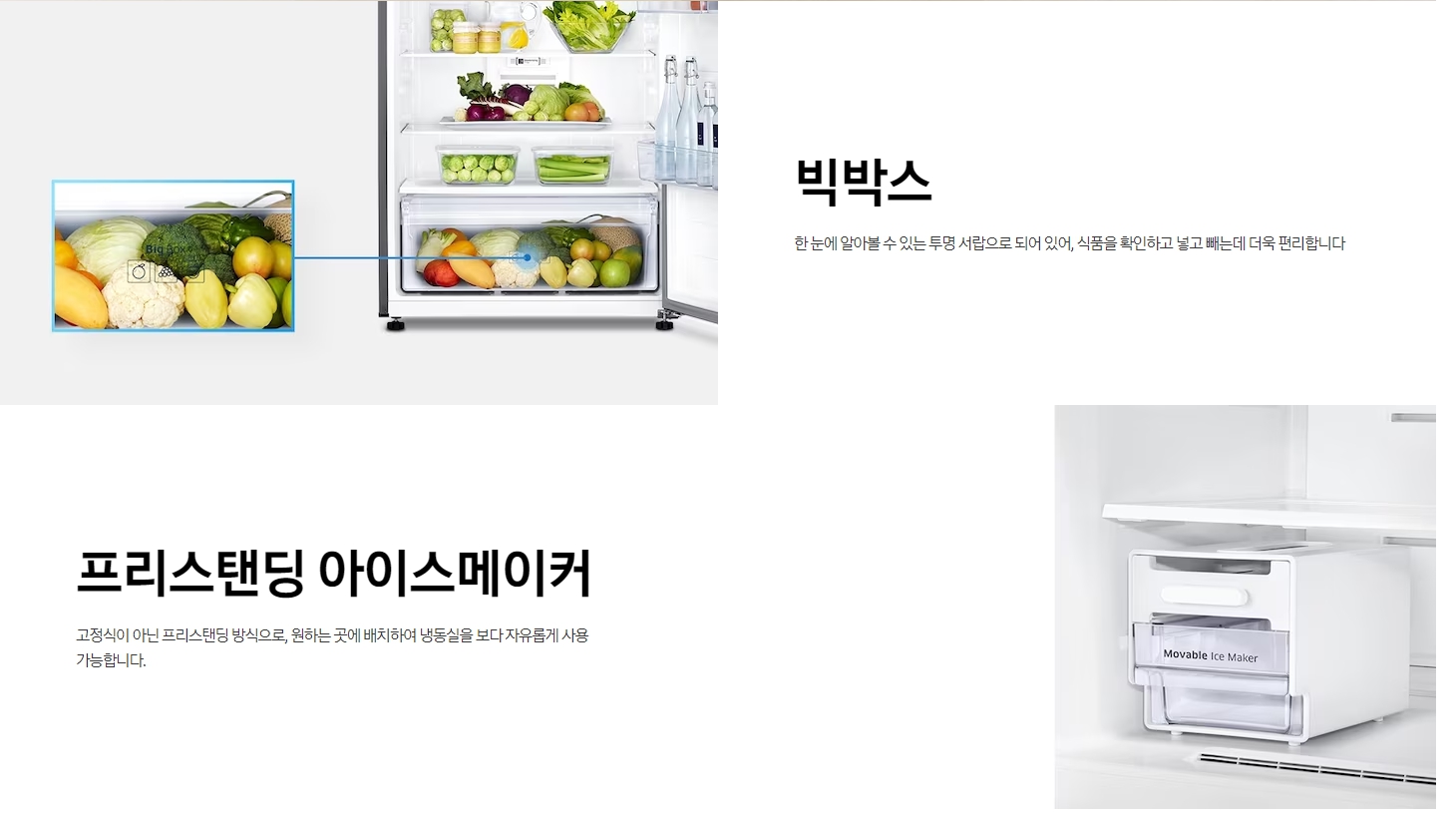 빅박스 : 한 눈에 알아볼 수 있는 투명 서랍으로 되어 있어, 식품을 확인 하고 넣고 빼는데 더욱 편리합니다.