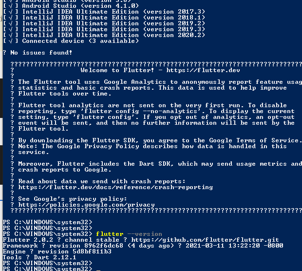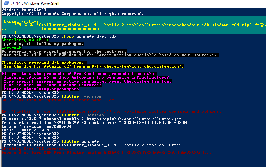 플러터 업그레이드 후 다트랑 플러터랑 다 제가 원하는 버전으로 올라 갔네요