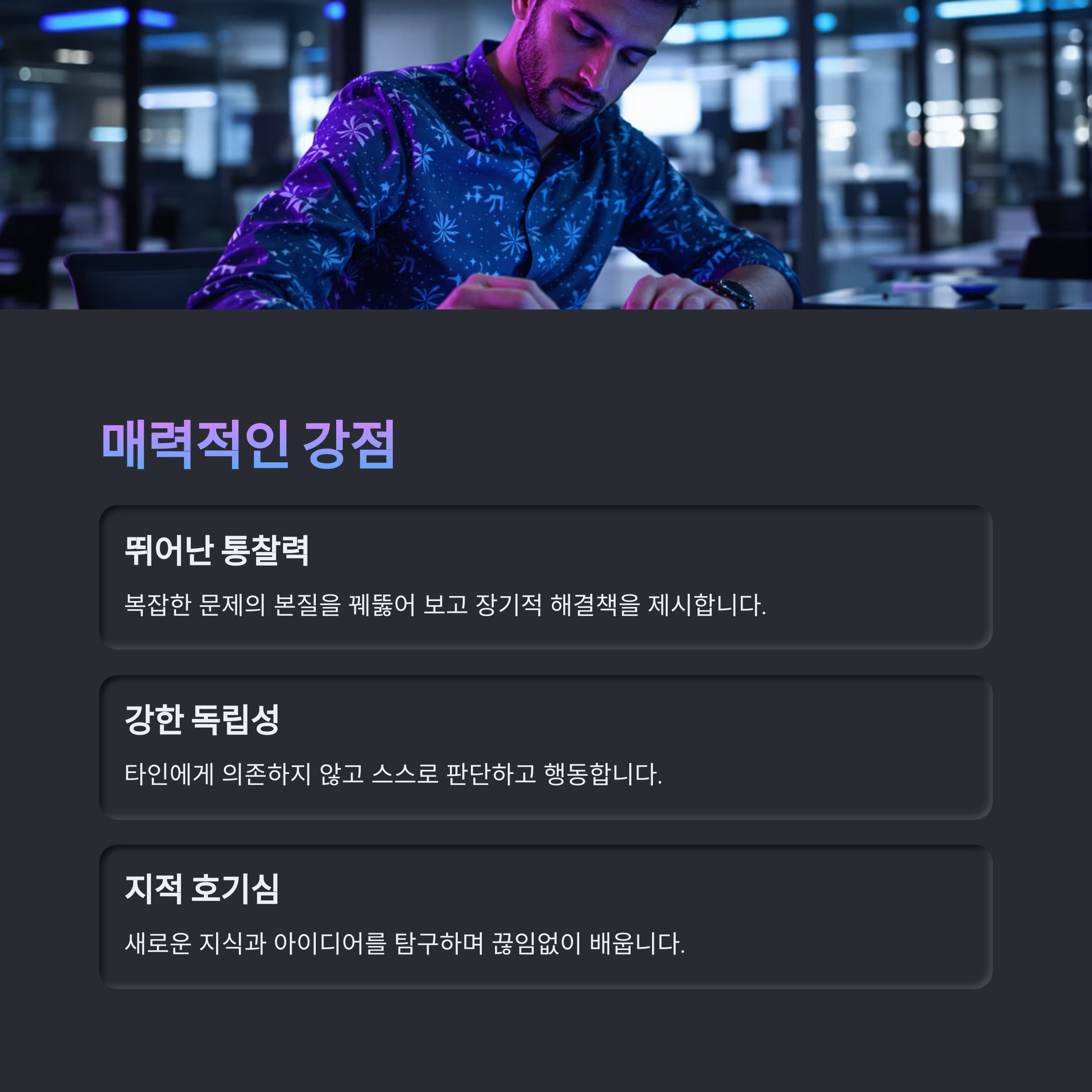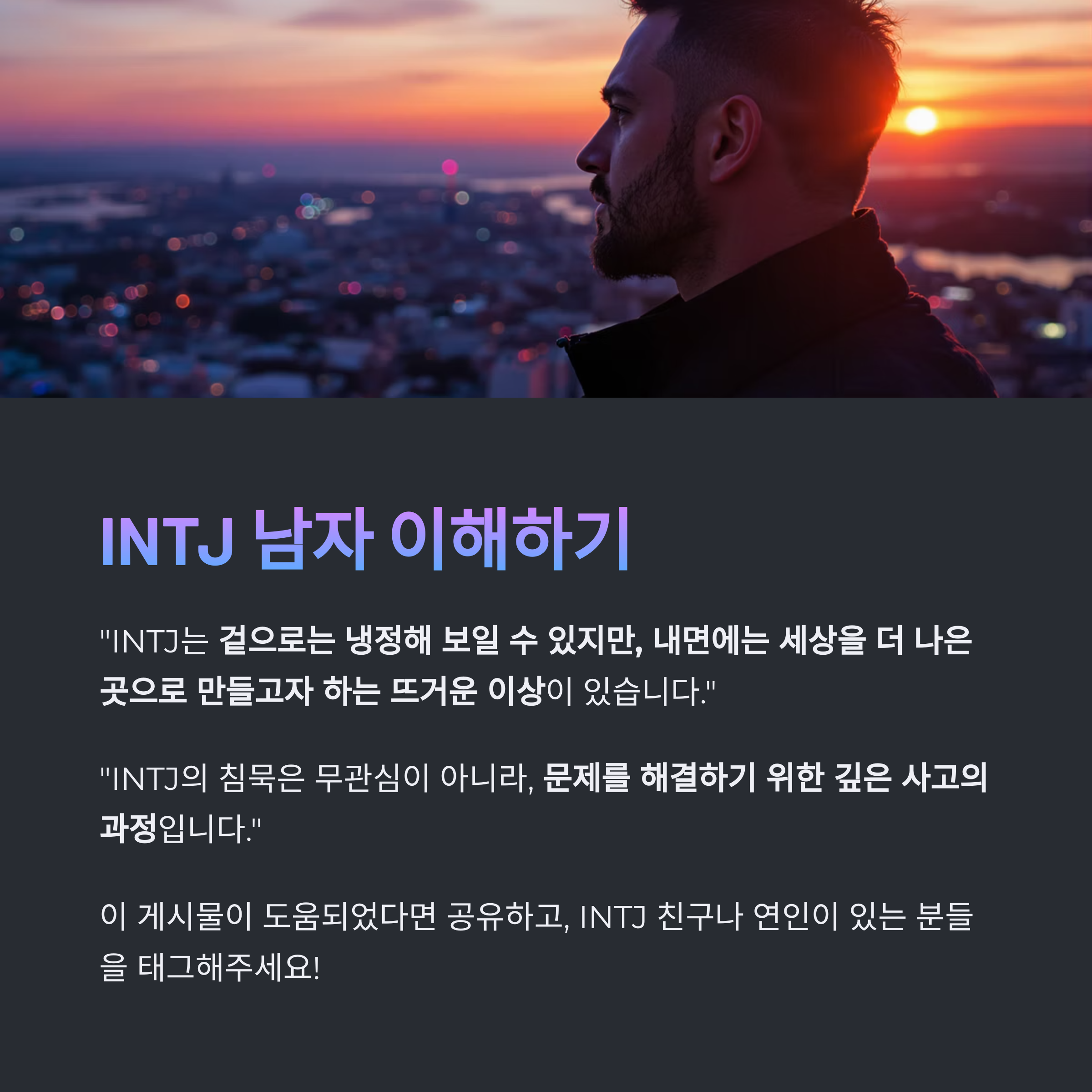 겉으로는 다소 무뚝뚝해 보일 수 있지만, 한번 마음을 연 상대에게는 깊은 신뢰와 헌신을 보여주는 것이 INTJ의 특징입니다.