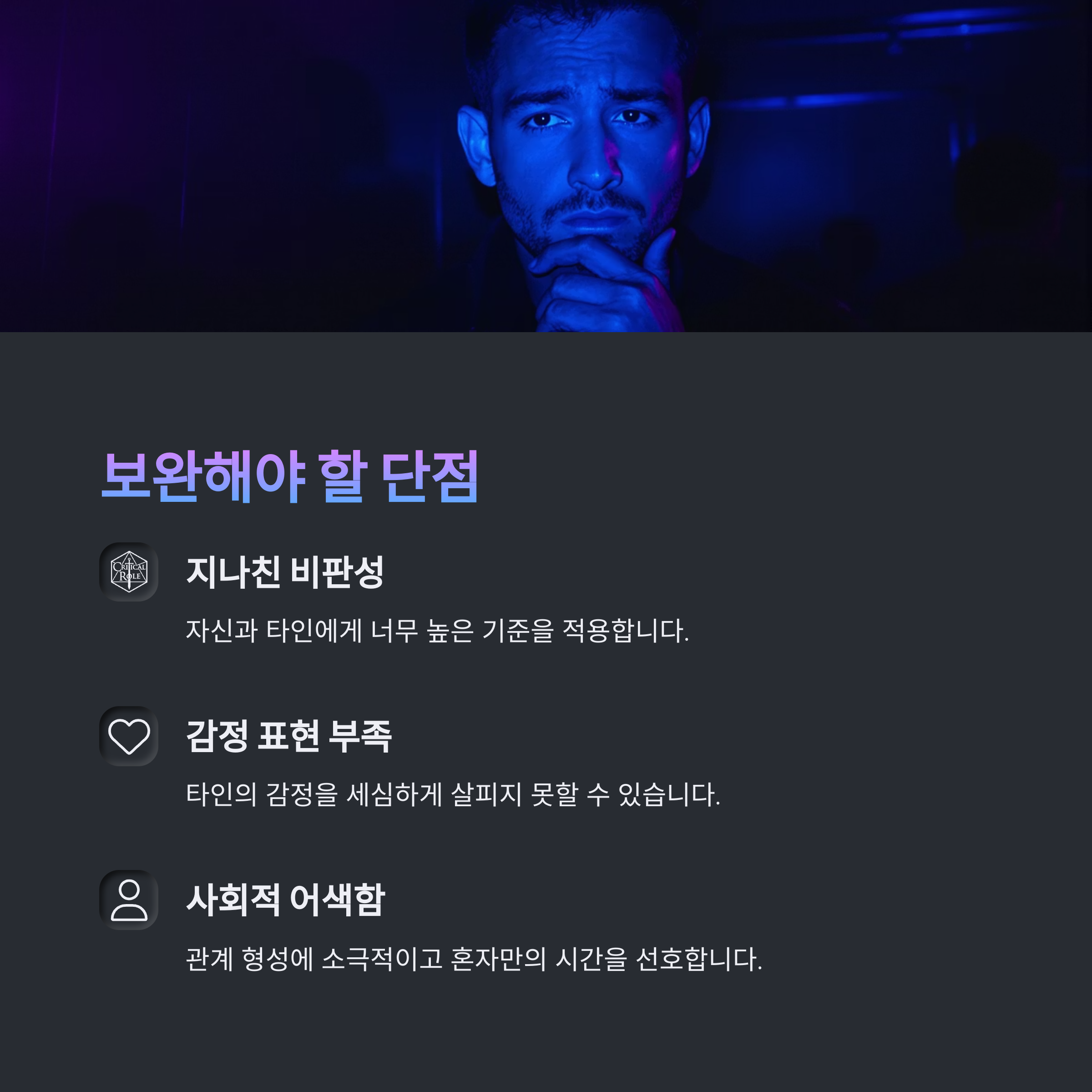 | INTJ는 지나치게 비판적이다. | 문제 해결을 위한 논리적 분석을 선호하며, 때로는 건설적인 피드백으로 이어질 수 있습니다. |