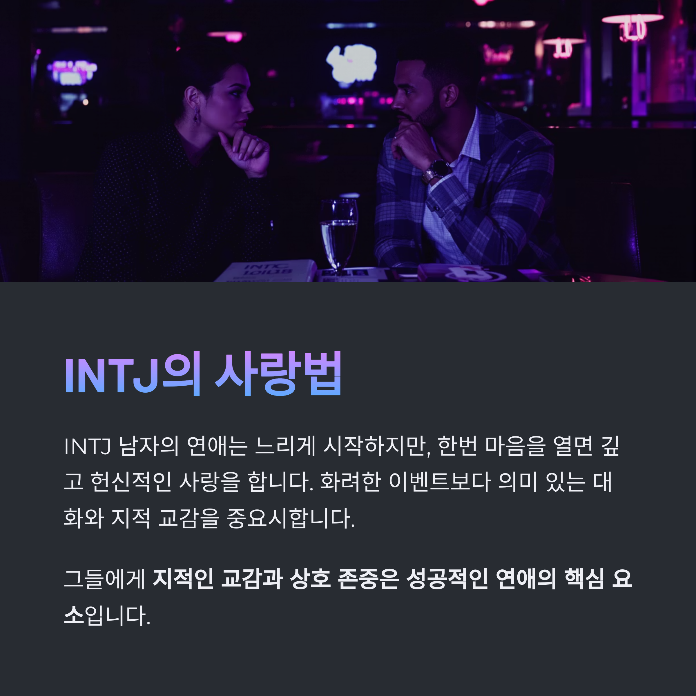 INTJ 남성은 연애에서도 지적인 연결과 논리적인 소통을 매우 중요하게 생각합니다.