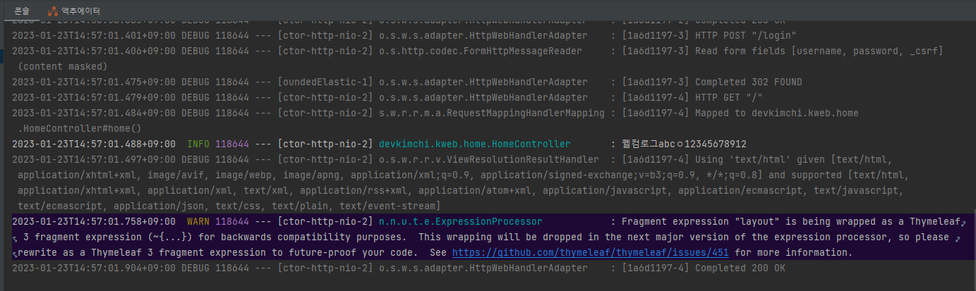 내가 찍은 로그를 눈에 띄게 표시해 주고 thymeleaf로 고생했는데 변경점들이 있어서 앞으로 변경될 사항도 warn으로 띄워주는데 눈에 잘 들어와서 코딩할 때 바꿔야겠다는 생각이 들게 해 준다.