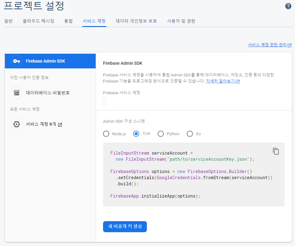 서비스 계정 > Firebase Admin SDK > 자바 > 새 비공개 키 생성 버튼을 누르면 json파일이 다운로드됩니다.