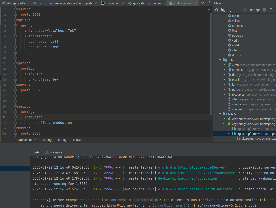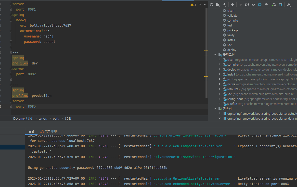 default profiles에 neo4j 샘플에 있는 기본 데이터 베이스 주소를 세팅 후 테스팅