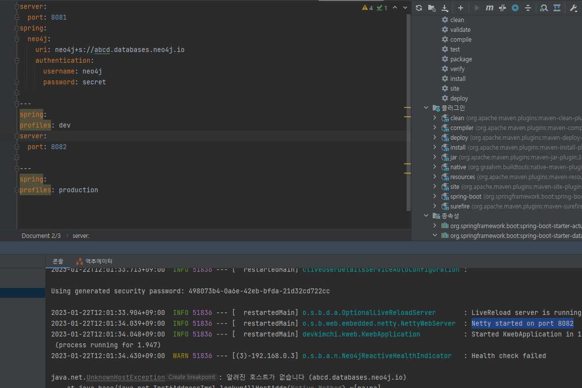 default 프로파일에 디비 정보를 읽고 dev 프로파일의 서버 포트가 적용된 것으로 보아