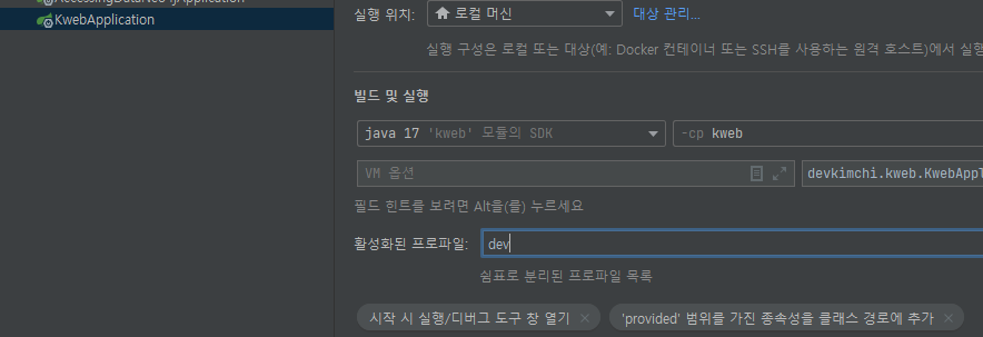 default 프로파일에 디비 정보를 읽고 dev 프로파일의 서버 포트가 적용된 것으로 보아