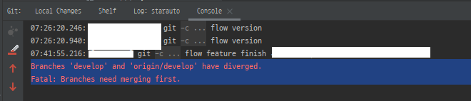 이제 git-flow를 마치고 feature를 finish 하려는 순간 위와 같은 오류가 난것이다