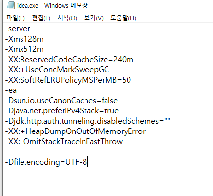 인텔리제이 설치 폴더 밑의 /bin 디렉토리에 보면 vmoptios를 설정해 줄수 있는 파일이 있다